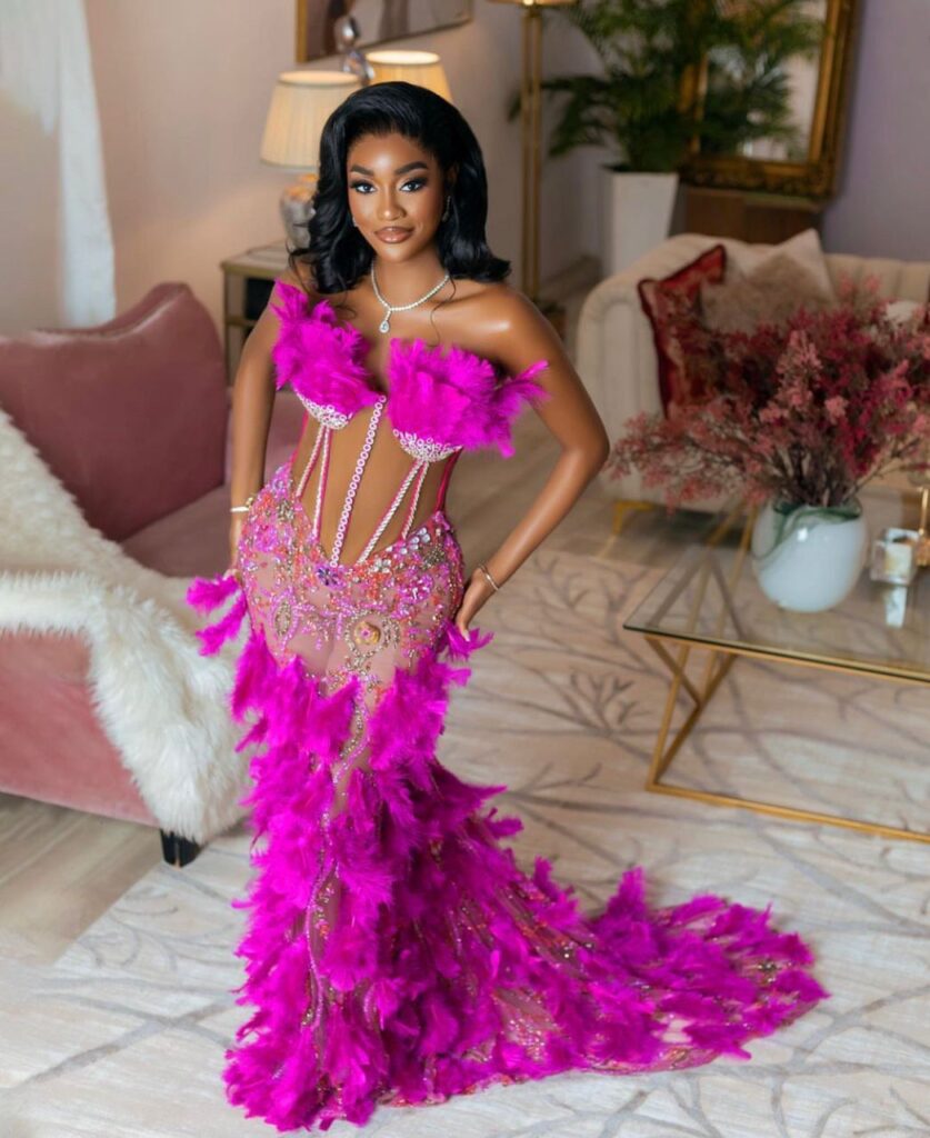 Beauty Tukura made a stunning debut in the premiere episode of the show. She donned an exquisite magenta corset dress featuring a sheer bodice and feathered train from XtraBrides Lagos. This gorgeous attire exudes a captivating royalty aura. She opted for a sultry look created by Bridgys Faces and coupled it with a sleek silver necklace to add sophistication to the ensemble.