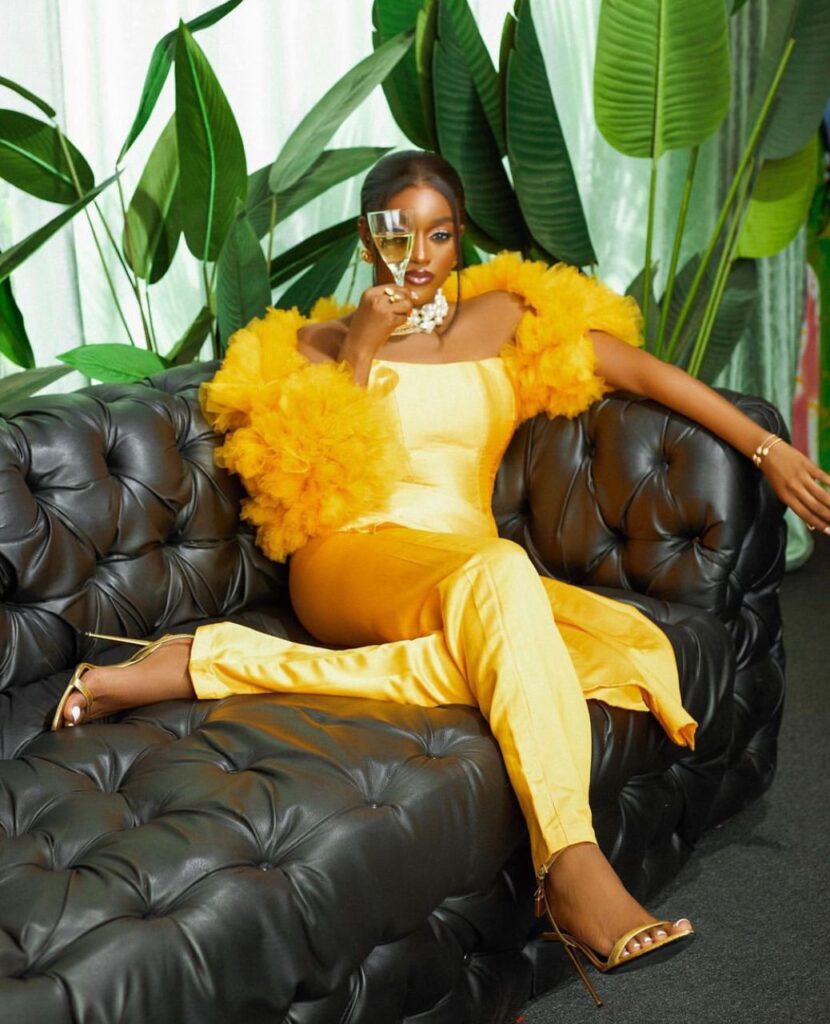 Beauty Tukura exudes confidence that is almost impossible to ignore. This incredible beauty queen captured our attention with her vibrant appearance on the screen. Her magnificent yellow jumpsuit with exaggerated feather sleeves designed by Good Girl Code looked classy. She added glamour to her ensemble by pairing it with gold sandal heels. The entire look was styled to perfection by the talented Dahmola, who brought out the best in her appearance.