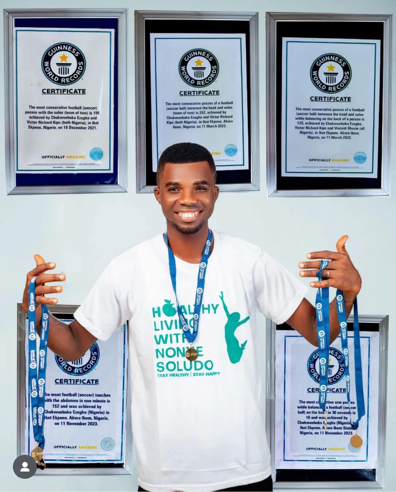 “Huge congratulations to the legendary Chukwuebuka Ezugha, who just became a Five-Time Guinness World Records holder after his attempts for the “Most Contortion Arm Passes While Balancing a Ball on the Head” and “Most Football Touches with the Abdomen in One Minute” were officially accepted by the global record keeper.