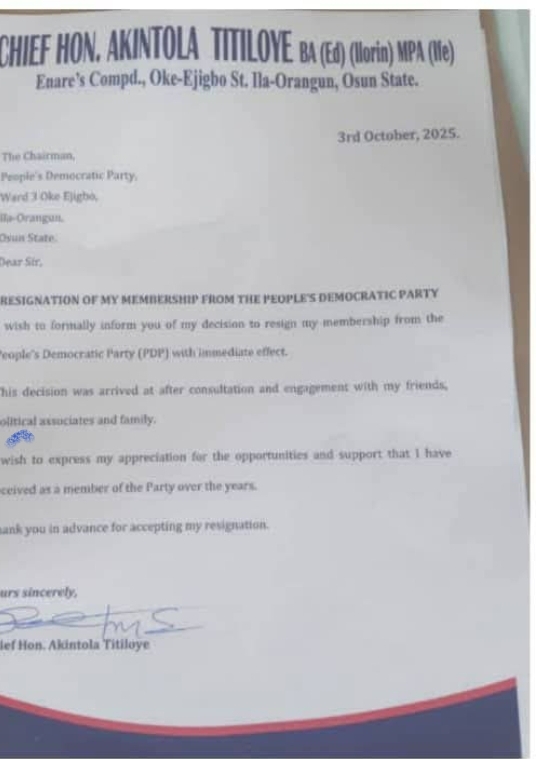 The letter, addressed to the PDP Ward Chairman of the 3rd Ward in Ila Local Government and copied to both the local and state chairmen, stated that his decision was personal and followed deep reflection. “I write to formally inform you of my resignation from the PDP with immediate effect. My decision is personal and based on careful considerations. I sincerely appreciate the support, cooperation, and kindness I have enjoyed from the party, its leadership, and members during my time as a member,” he wrote.