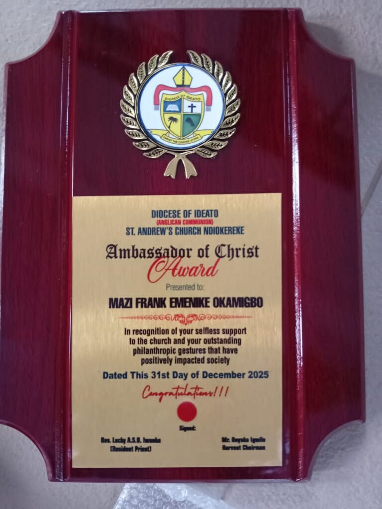 Even as he mourns the passing of his beloved mother, Lady Adaeze Asa Black Nnem, renowned nightlife impresario Franklin Emenike Okamigbo, popularly known as Frank Papas, has been honoured by the Diocese of Ideato (Anglican Communion), St. Andrew’s Church, Ndiokereke, with the Ambassador for Christ Award—a recognition that has cast a warm light on a season of personal grief.