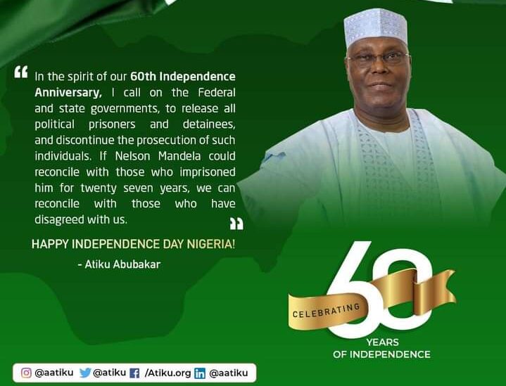 As such, in the spirit of our 60th Independence Anniversary, I call on the Federal and state governments, to release all political prisoners and detainees, and discontinue the prosecution of such individuals. If Nelson Mandela could reconcile with those who imprisoned him for twenty seven years, we can reconcile with those who have disagreed with us.