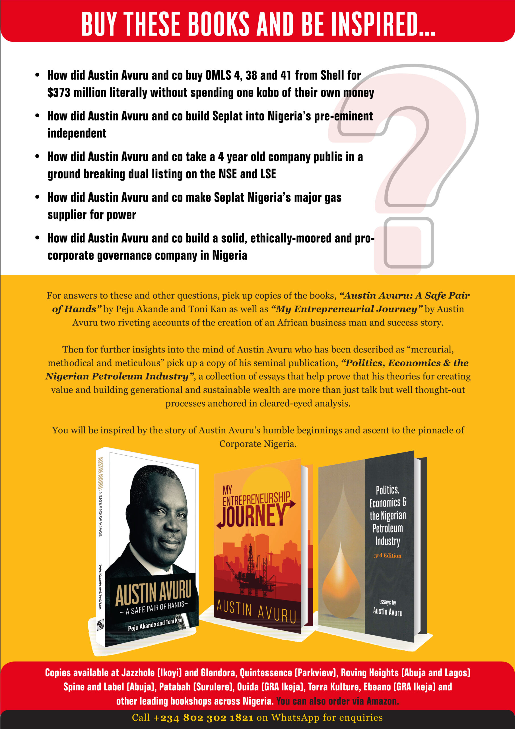 The injunction was issued days to the scheduled public presentation of the books – My Entrepreneurship Journeyand Politics, Economics and the Nigerian Petroleum Industryall by written by Austin Avuru – Founding CEO, Seplat Energy. The third book, Austin Avuru: A Safe Pair of Hands is a biography of the mercurial and methodical oil man written by the duo ofPejuAkande and Toni Kan