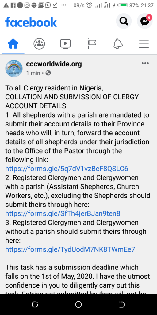 Celestial Church Directs All Shepherds & Church Workers In The Country To Send Bank Account Details To HQ For Lockdown Relief!