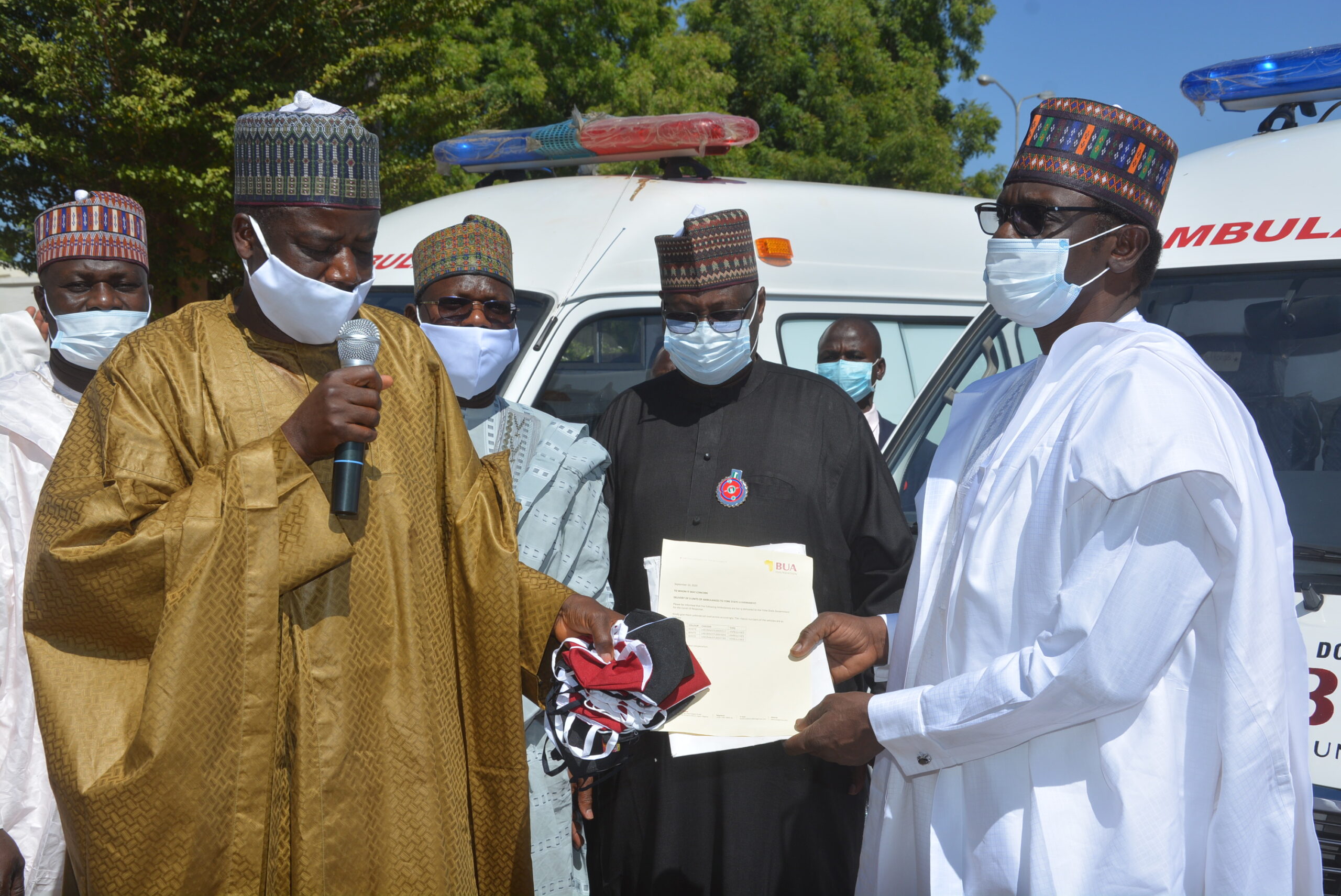 “Coming At Right Time” Gov Buni Hails BUA’s Donation Of 100,000 Facemasks & Ambulances To Fight Covid-19 In Yobe