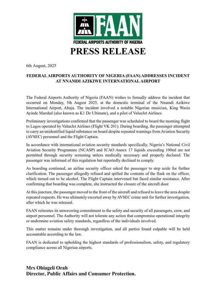 On the morning of August 5, 2025, Fuji icon, King Wasiu Ayinde Marshal (KWAM 1), also known as K1 De Ultimate, was at the centre of a dramatic safety incident at Nnamdi Azikiwe International Airport, Abuja—an episode that has since triggered a nationwide conversation about aviation protocol, celebrity privilege, and public safety.