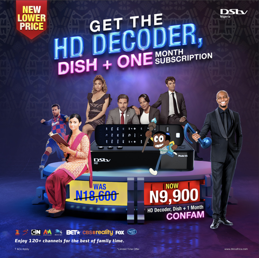 To get the most out of your favourite shows and to enjoy a host of new shows, you can buy the DStv HD decoder, dish kit and get a 1-month subscription on Confam package, all at a discounted price of N9,900 only instead of N18,600.