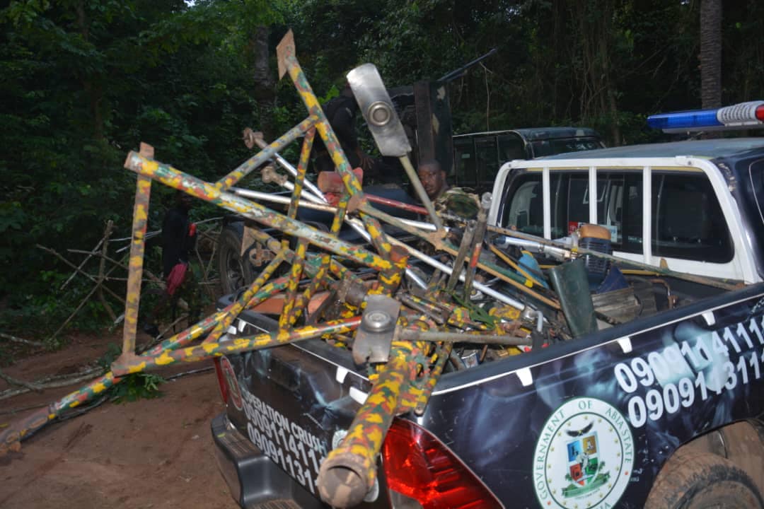 The gallant troops recovered, three locally fabricated Rocket Propelled Grenade launchers, two locally fabricated Artillery gun with tripod and its bombs. Other items recovered include dane guns, Biafran flags as well as Toyota Tundra and Hilux vehicles that were burnt insitu. Also all of their camps with different inscriptions were destroyed.