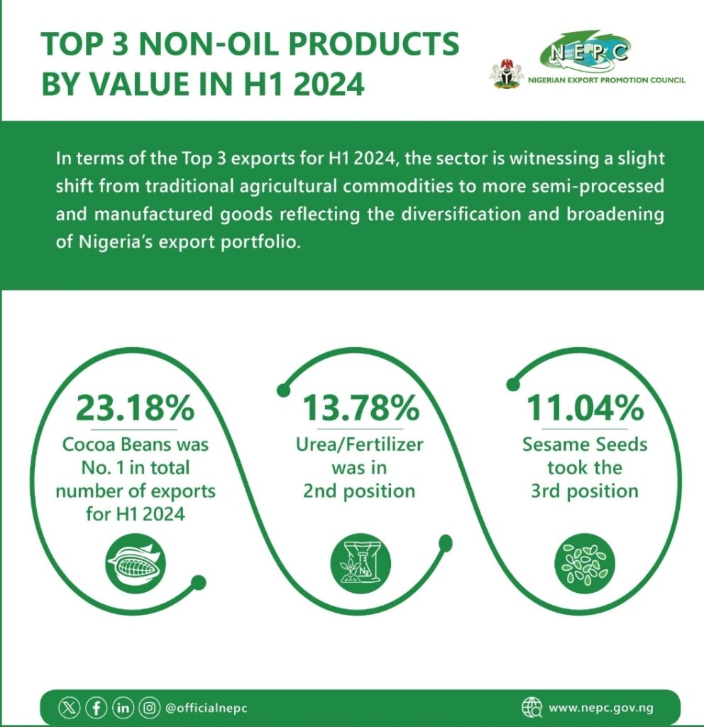 Nonye Ayeni, executive director and chief executive officer of the Nigerian Export Promotion Council (NEPC) says Nigeria recorded total receipts of $2.7bn from non-oil exports in the first half of 2024.