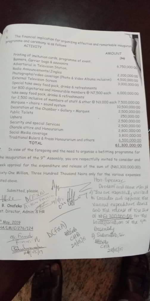The statement asserted signed by Abati asserted that ‘’ For the avoidance of doubt, the entire inauguration of the 9th Assembly can be summed into a total of N61.3 million as the document accompanying this response shows.