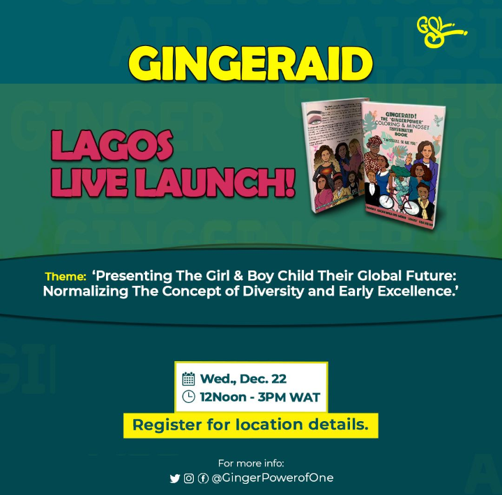 “GingerAid! The ‘Ginger Power’ Coloring & Mindset Transformation Book”, an engaging interactive, inspiring and aspirational colouring and activity book for girls of minority classification, will hold a Lagos premiere at a private gathering on Wednesday, December 22, from 12 – 3 pm.