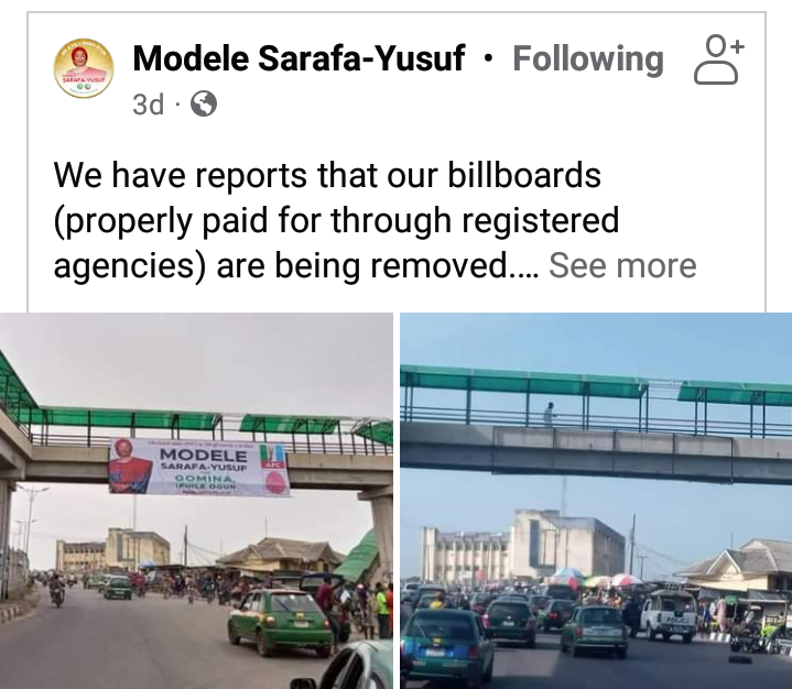 Ogun gubernatorial aspirant Modele Sarafa – Yusuf, has accused Governor Dapo Abiodun of removing her campaign materials.