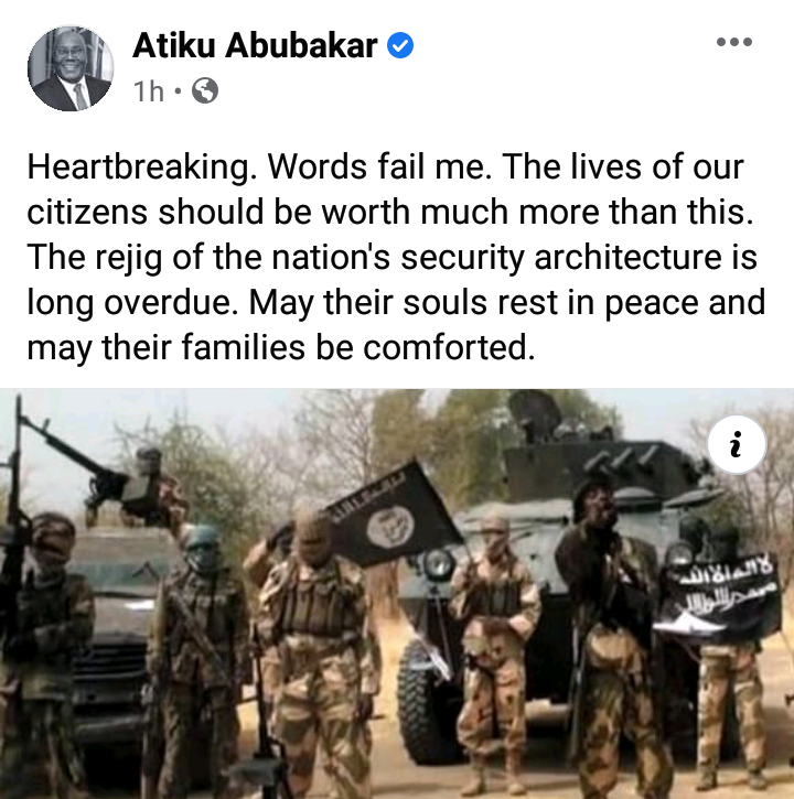 Reacting to the ugly incident in a post monitored by societynow.ng, Atiku posted “Heartbreaking. Words fail me. The lives of our citizens should be worth much more than this. The rejig of the nation’s security architecture is long overdue. May their souls rest in peace and may their families be comforted.”