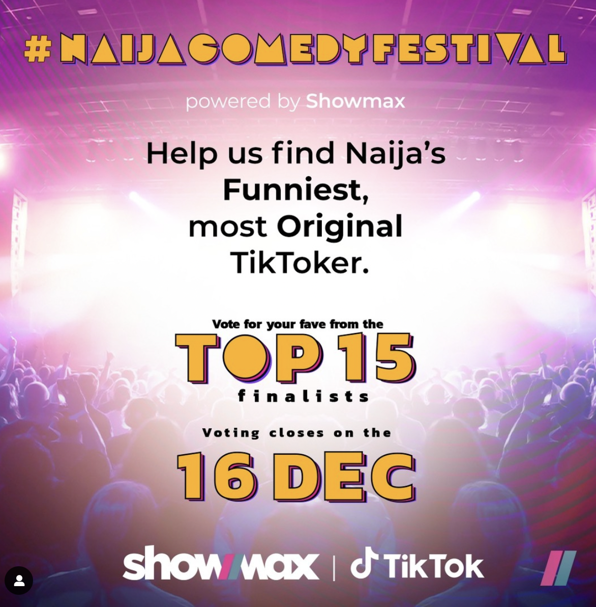 The TikTok Naija Comedy Festival, powered by Showmax, is an online challenge that allows content creators to post their original comedy or skit on TikTok with the hashtag #NaijaComedyFestival. The challenge kicked off on the 10th of November and received hundreds of entries that have been shortlisted to the top 15.