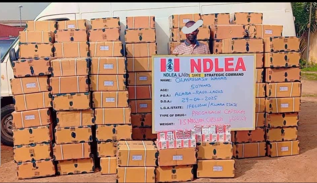 In Lagos, a total of 1,500,000 pills of a controlled opioid were recovered from a suspect Olarenwaju Wahab at the Alaba-Rago area of Ojo on Tuesday 29th April while the source of the consignment was traced to Q104B Road 25, Victoria Garden City, Lekki, which is the residence of one Obinna Kenneth who is now at large.