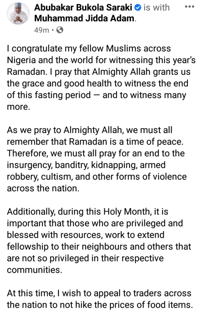 Former Senate President Bukola Saraki has released a good message to sign post the beginning of Ramadan.