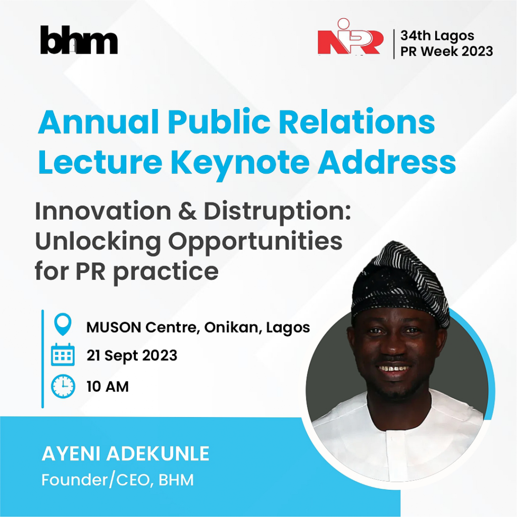 The Chief Executive Officer of BHM, Ayeni Adekunle, will give the keynote address at the Lagos NIPR’s 34th Annual Public Relations Lecture on Thursday, September 21, 2023, at the MUSON Centre in Onikan, Lagos.