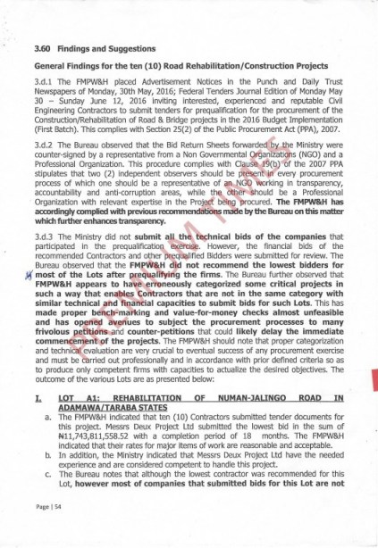 Commenting specifically on each of the 10 projects one after the other, the Bureau noted that although the ministry recommended the lowest contractor for the N11.7 billion Numan-Jalingo Road project, most of the companies that submitted bids for the project were not in the same category and ranking that would enable proper bench-marking.