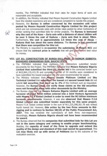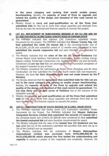 On the replacement of substandard bridges along Gusau-Sokoto Road, the Bureau said the ministry considered the submission of Messrs. China Zhonghao and Ric Rock Construction Ltd that submitted the third and fourth lowest bids non-responsive.