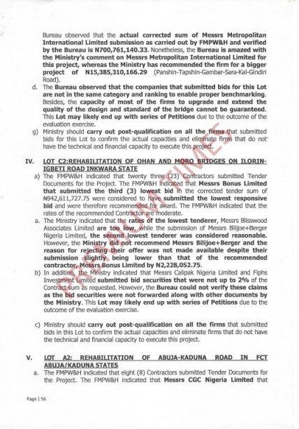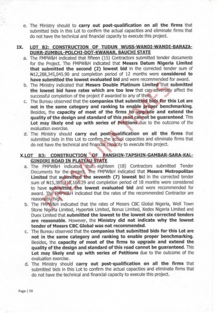 “Nonetheless, the Bureau is amazed with the ministry’s comment on Messrs. Metropolitan International Limited for this project, whereas the ministry has recommended the firm for a bigger project of N15,385,310,166.29 [Pankshin-Tapshin-Gambar-Kal-Gindiri Road].”