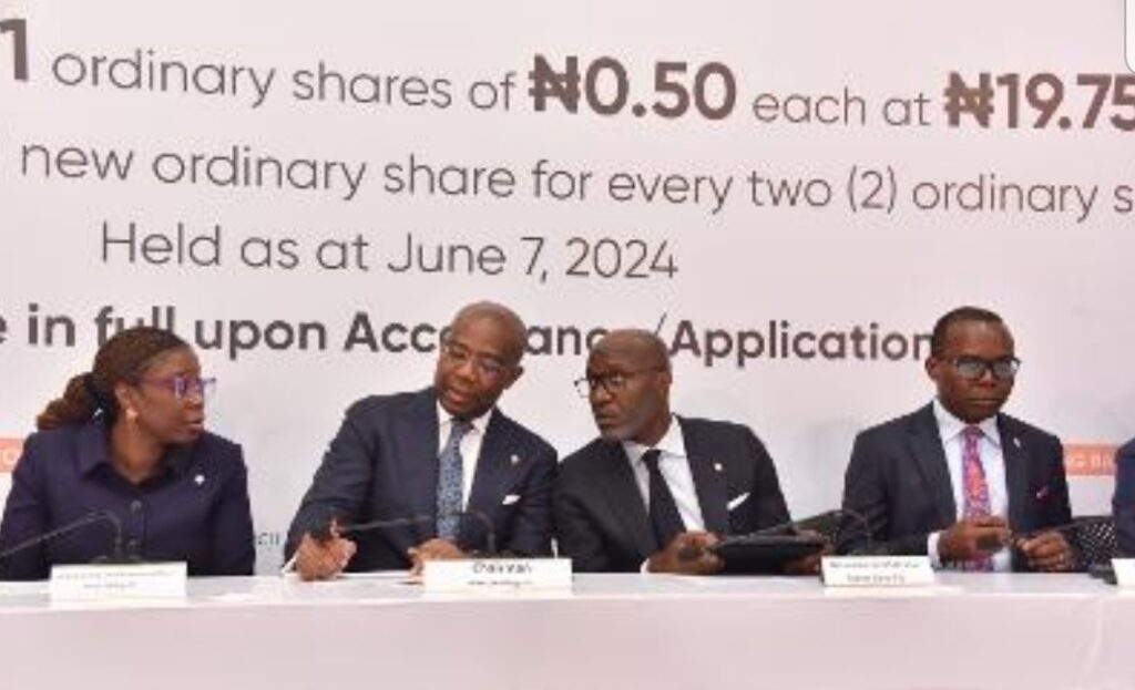 Under the Rights Issue, 17,772,612,811 (Seventeen billion, seven hundred and seventy-two million, six hundred and twelve thousand, eight hundred and eleven) ordinary shares of N0.50 each at N19.75 per share on the basis of 1 (one) new ordinary share for every 2 (two) existing ordinary shares held as of Friday, June 7, 2024.