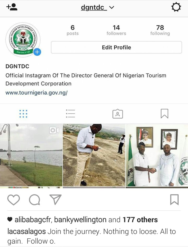 And underneath the handle identity the description “Official Instagram Of The Director General Of The Nigeria Tourism Development Corporation”.