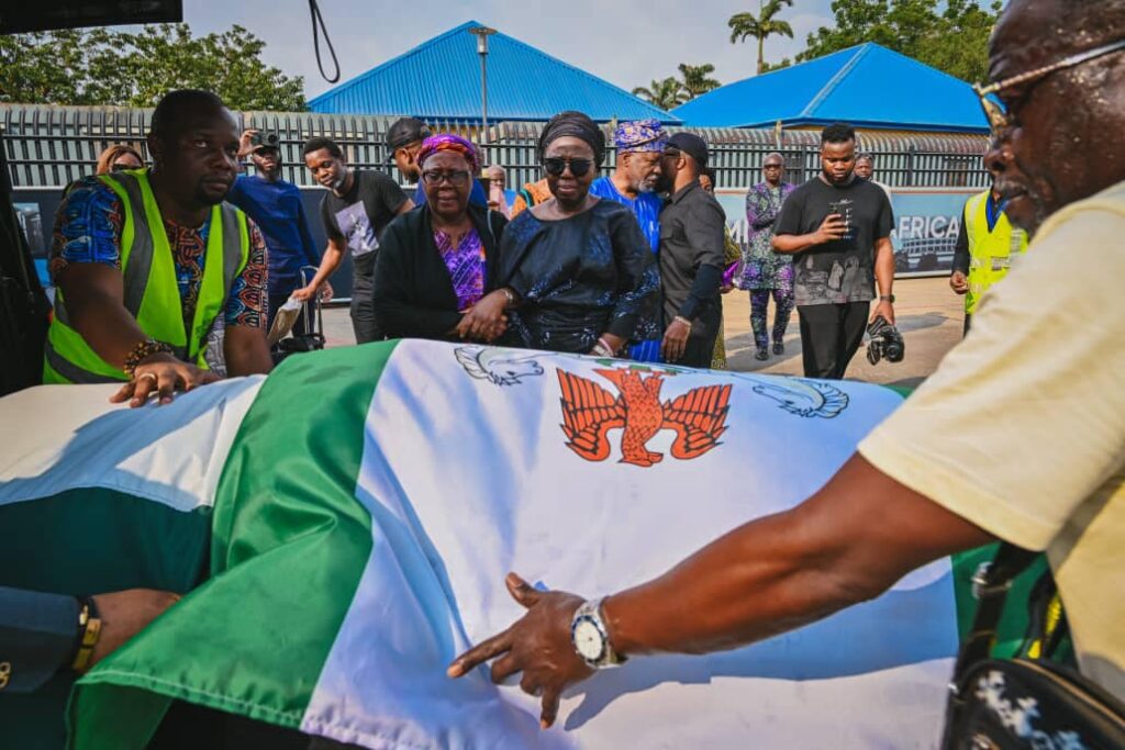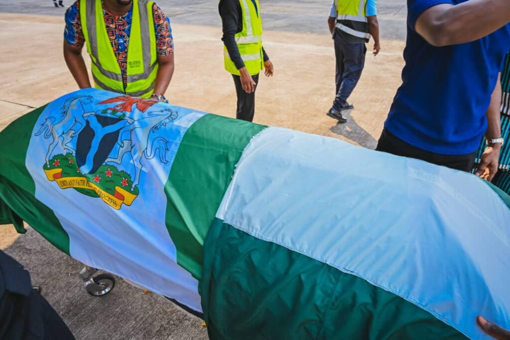The plane conveying the body arrived at the private wing of Murtala Muhammed International Airport, Lagos State about 3:39 p.m on Friday, January 5.