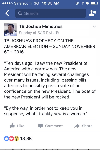 Prophet TB Joshua’s Prediction Hillary Clinton Would Win US Presidential Election Disappears From His Facebook Page After Donald Trump Triumphed