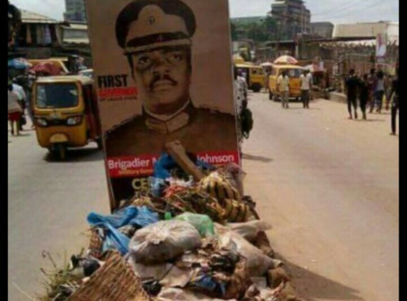 Unknown individuals heaped refuse on one of the famous signages celebrating the heroes of Lagos as part of the state’s 50th anniversary celebration.