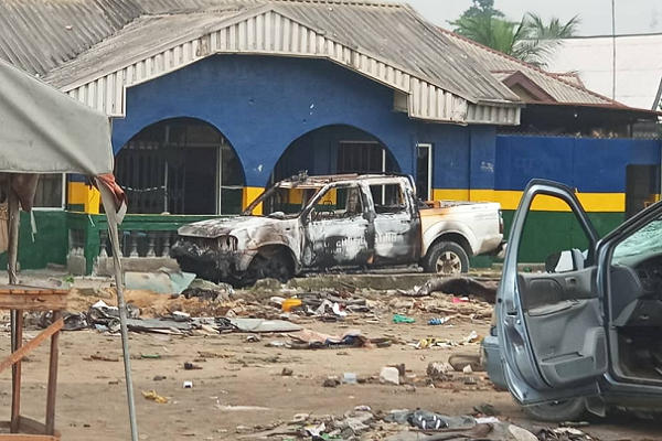 Three Police Stations in Rivers State came under attack yesterday 21/10/2020 at about 2130hrs when hoodlums numbering about 500 suspected to be members of the proscribed Indigenous Peoples of Biafra (IPOB) invaded the Oyigbo Area Command, Oyigbo and Afam Police Stations, setting them ablaze and damaging about fifteen vehicles including one Armored Personnel Carrier (APC).