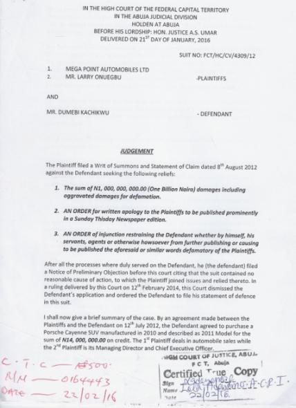 Larry had initiated a court action back in 2012 against Dumebi over sponsored lies against him by the socialite to avoid payment of N14million for a Porsche Cayenne he bought.