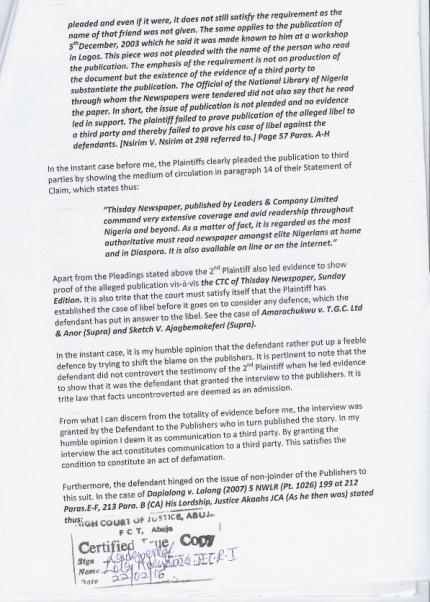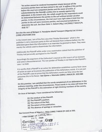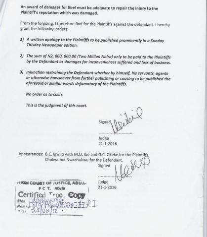 2. An ORDER for written apology to the Plantiffs to be published prominently in a Sunday Thisday Newspaper edition.
