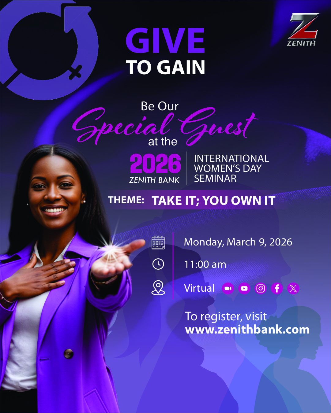 Aligned with the global theme ‘Give to Gain” which underscores the principle that sustainable progress is achieved when individuals and institutions invest intentionally in women, Zenith Bank’s 2026 IWD seminar is themed “Take It, You Own It.”