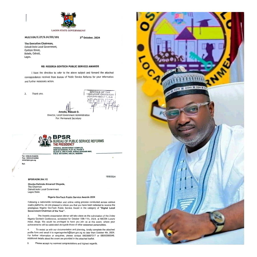 The letter from the BPSR, forwarded to the Local Government by the Lagos State Ministry, states in part: “…we are pleased to inform you that you have been selected to receive the prestigious Nigeria GovTech Public Service Award in the category of ‘Digital Local Government Chairman of the Year.’”