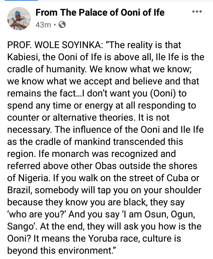 Elated handlers of the Ooni Ife copied the comment by Soyinka and published it on the official page of the Palace of the revered king.