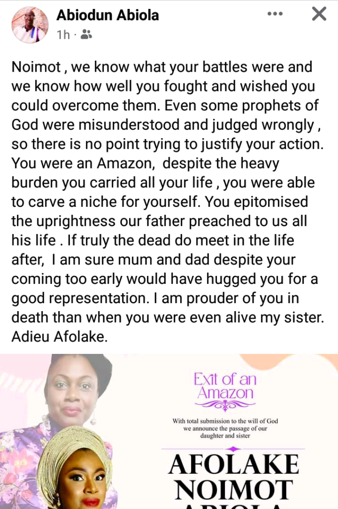 Abiodun Abiola, the brother to the 47year old accountant who committed suicide at her residence in Osapa London, Afolake Noimot Abiola has written a touching tribute in honor of his sister.