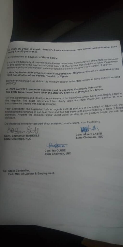 The organized labour in a letter dated “June 22 “ and signed by State Chairman NLC – Emmanuel Bankole, State Chairman TUC – Akeem Lasisi, and State chairman JNC – Isa Olude requested a dialogue with the Governor over the demands to avert the strike.