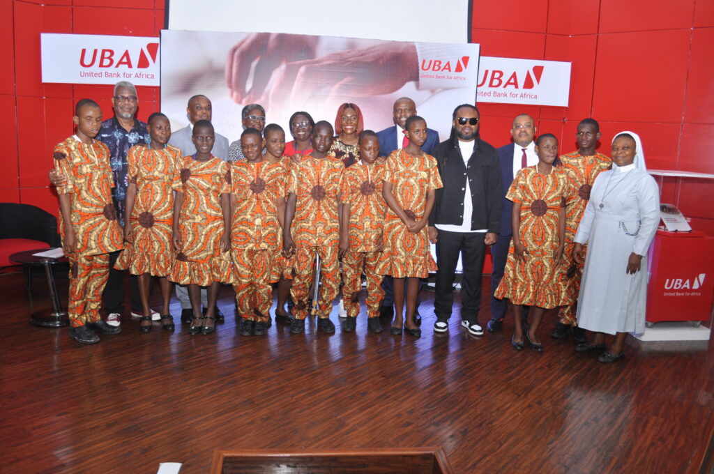 L-R: Past-Chairman, Anglo-Nigerian Welfare Association for the Blind(ANWAB), Ogie Eboigbe; Tutor, Pacelli School of the Blind, Sister Christiana Ekechukwu; Board Member, ANWAB, David Okon; Chairman, ANWAB, Ms Barbara Wey; Official, Ministry of Education, Grace Abimbola; Former, Senior Special Assistant to the Lagos State Governor on Persons Living with Disability, Adenike Oyetunde-Lawal; Executive Director, Finance and Risk Management, United Bank for Africa(UBA), Ugochukwu Nwaghodoh; Nigerian Musician and Producer, Cobhams Asuquo; and Executive Director, Group Operations, UBA, Alex Alozie, flanked by Students of Pacelli School for the Blind, during the launch of Braille Account Opening Form for virtually impaired people, held in Lagos on Tuesday