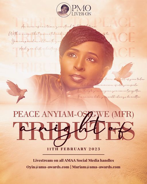 This is to announce that we will be hosting a tribute night in honor of the legacy of Peace Anyiam-Osigwe, the founder of the Africa Movie Academy Awards (AMAA). The tribute night will be held on February 11th, 2023 at 4 pm.