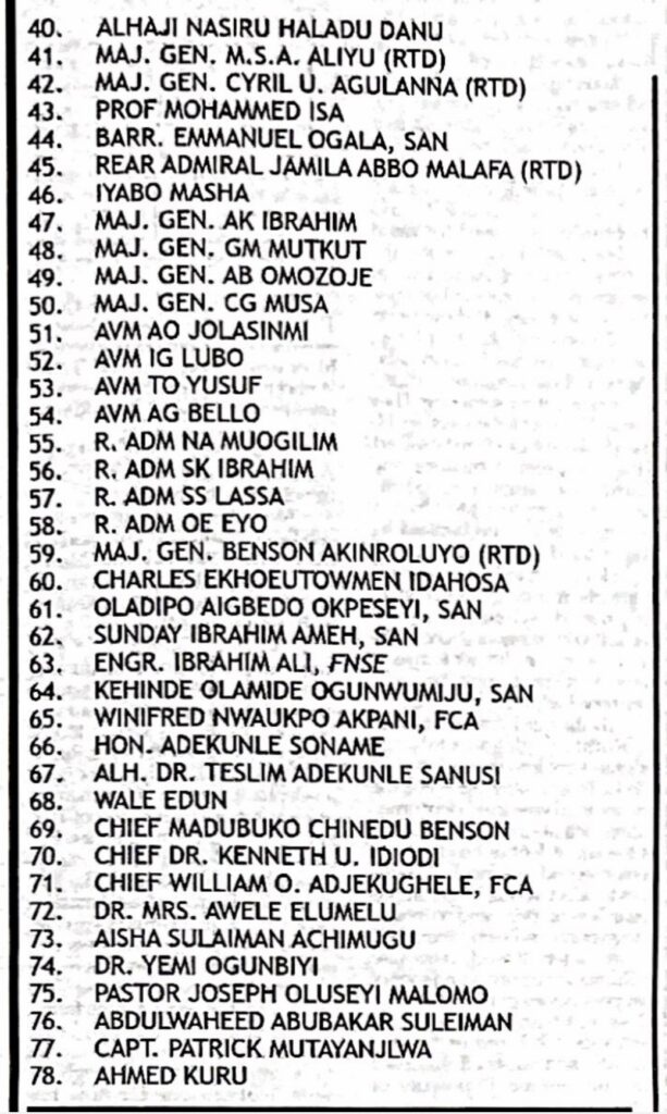 Some of the names are Emeka Anyaoku, Senator Oluremi Tinubu, Godwin Emefiele, Awele Elumelu, Chief Bisi Akande, Herbert Wigwe, Nneka Onyeali-Ikpe, Mamman Dura, Owem Omogiafo, Mariam Olusanya, and other notable Nigerians