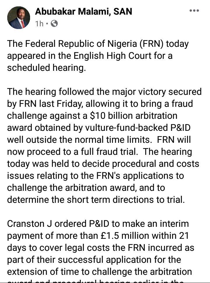 “This is another crucial win for Nigeria in our ongoing fight against the vulture-fund-backed P&ID. We are pleased that the English Courts have taken our fraud challenge seriously, and awarded us a substantial interim payment in respect of our successful application for an extension of time to challenge the award.