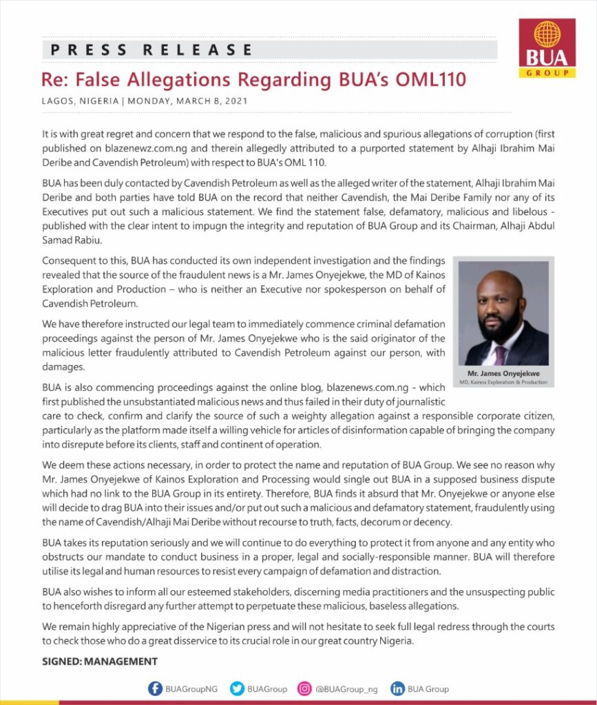It is with great regret and concern that we respond to the false, malicious and spurious allegations of corruption (first published on blazenewz.com.ng and therein allegedly attributed to a purported statement by Alhaji Ibrahim Mai Deribe and Cavendish Petroleum) with respect to BUA’s OML 110.