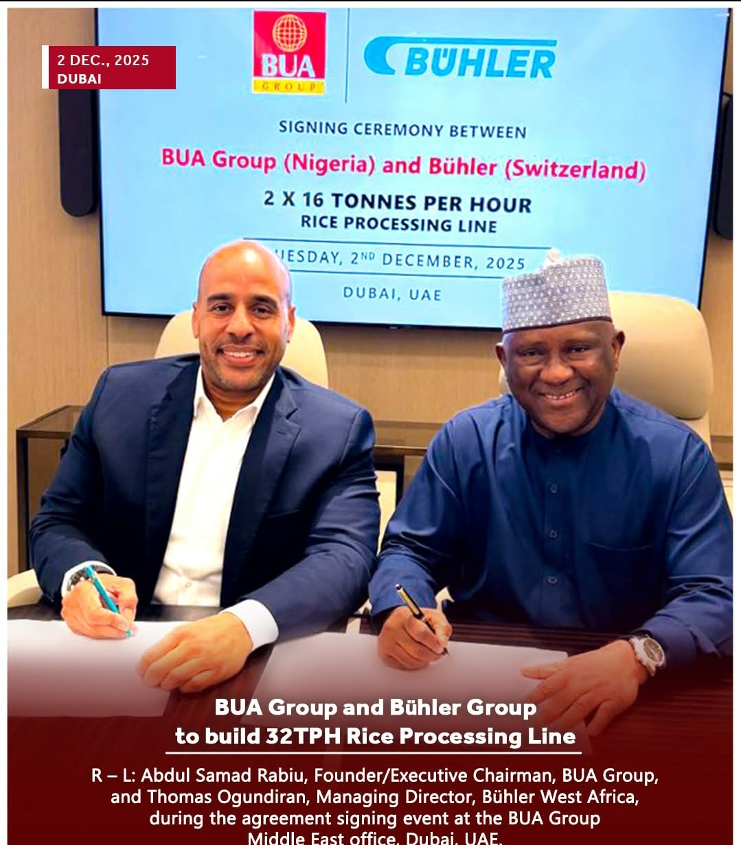 The deal was sealed at BUA Group’s Middle East office in Dubai on December 2, 2025, with Abdul Samad Rabiu, Founder and Executive Chairman of BUA Group, and Thomas Ogundiran, Managing Director of Bühler West Africa, signing the agreement.