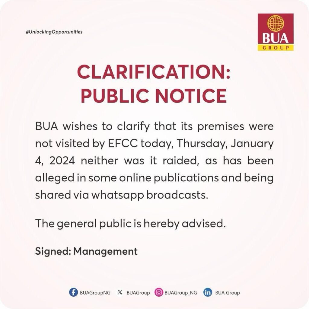 “BUA wishes to clarify that its premises were not visited by EFCC today, Thursday, January 4, 2024 neither was it raided, as has been alleged in some online publications and being shared via whatsapp broadcasts.”