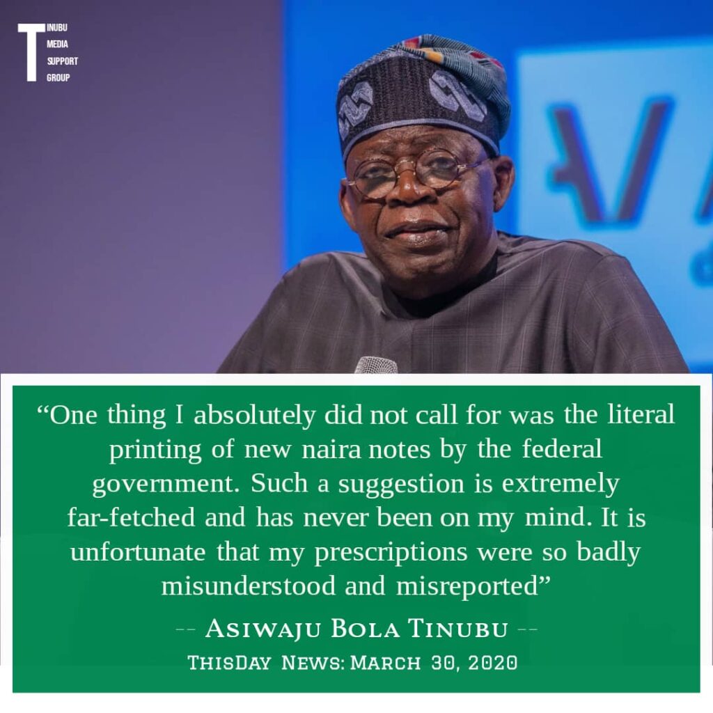 Tinubu’s counsel, regarding how to use the Naira in staving off the threats from the pandemic that he urged all Nigerians to come together against, was “misreported” in reports dated March 29, 2020.