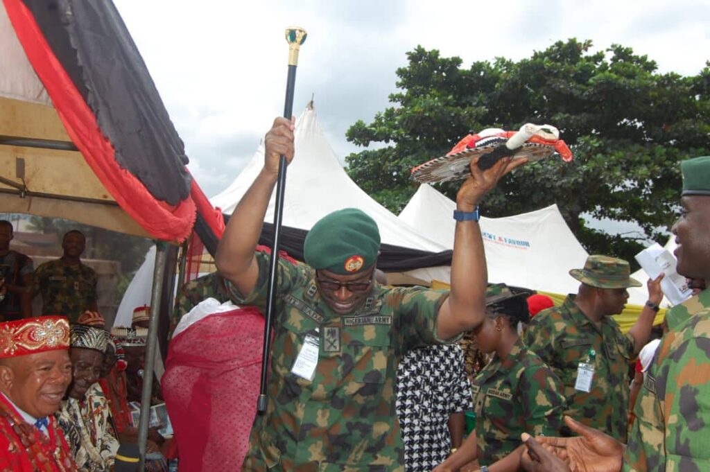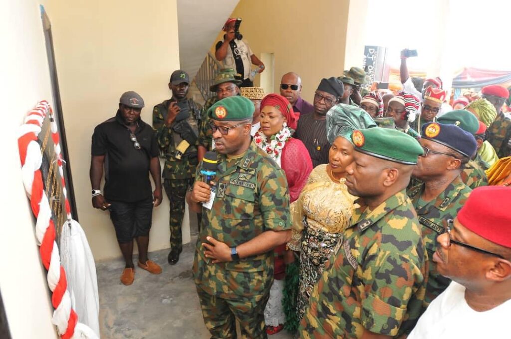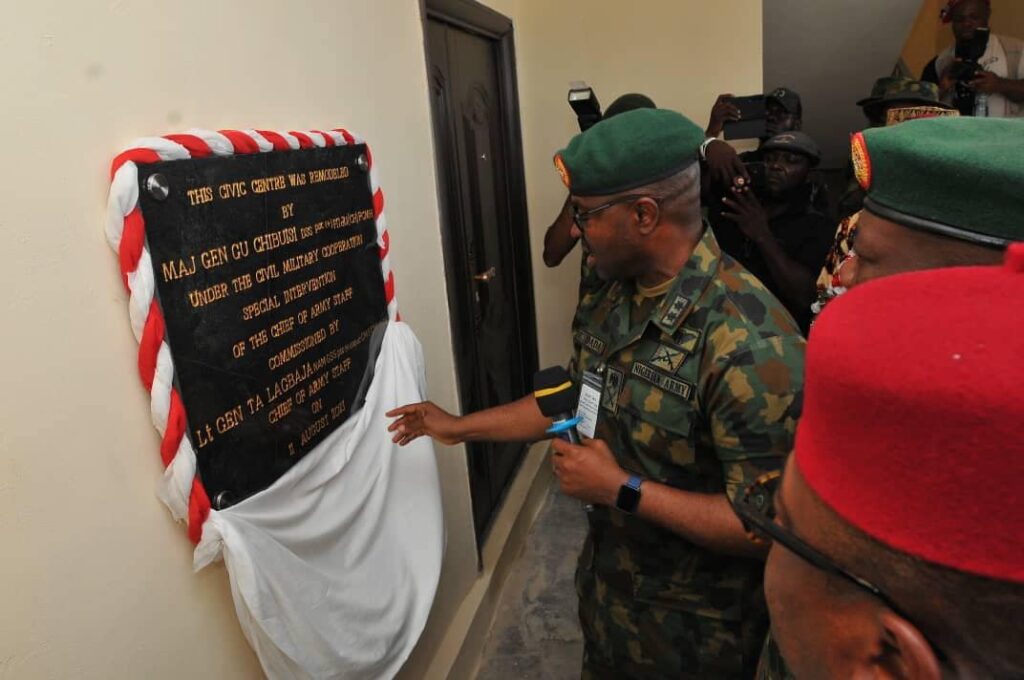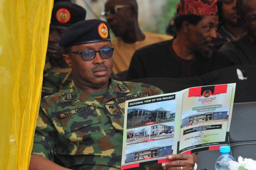 In winning the hearts and minds of the populace, the Chief of Army Staff (COAS) Lieutenant General Taoreed Lagbaja ably represented by the General Officer Commanding 82 Division Major General Hassan Taiwo Dada on Friday 11 August 2023 commissioned a remodelled Civic Center in Amaeke Item of Bende Local Government Area of Abia State.