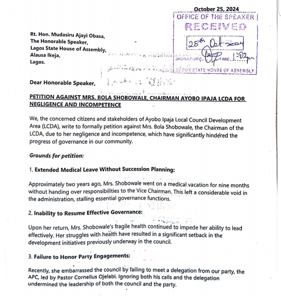 Information available reveals that top shots at the Ayobo-Ipaja Local Government Development Area (LCDA) will appear before the Lagos State House of Assembly this week.
