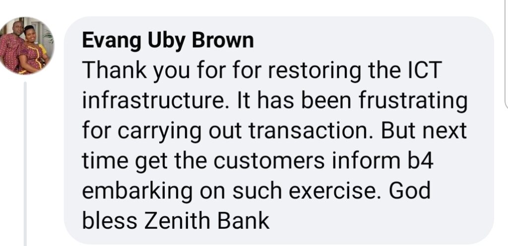 “Thank you for restoring the ICT infrastructure. It has been frustrating for (sic) carrying (sic) out transaction (sic). But next time, get the customers inform (sic) b4 embarking on such exercise (sic). God bless Zenith Bank,” an account holder with the social username “Evang Uby Brown” commented on the industry leader’s continuing announcement of restoring full service in a Facebook post on Thursday, October 10, 2024.