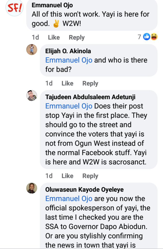 Reacting to one of such campaigns, Emmanuel Ojo the Senior Special Adviser to Governor Abiodun on Social Media declared “All of this won’t work. Yayi is here for good. W2W”.