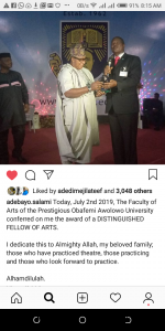 The elated actor more popularly known as Oga Bello – his character in the famous Drama series of yore, Awada Kerikeri – celebrating the development on his Instagram social media page stated ‘’I dedicate this to almighty Allah, my beloved family, those who have practiced theatre, those practicing and those who look forward to practice.